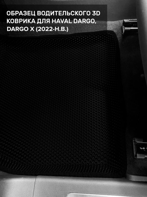 Автомобильные 3д коврики для Haval Dargo (2022-н.в.) в салон авто и багажник сделаны из инновационного полимерного материала EVA, изысканная структура в виде ячеек не дает воде, пыли и снегу разлетаться по салону машины и багажнику. 3д коврики зафиксированы на полу определенными клипсами, соответствующими Haval Dargo (2022-н.в.), и не двигаются в процессе езды.