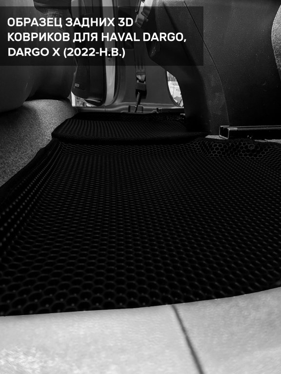 Автомобильные 3д коврики для Haval Dargo X (2022-н.в.) в салон авто и багажник сделаны из инновационного полимерного материала EVA, изысканная структура в виде ячеек не дает воде, пыли и снегу разлетаться по салону машины и багажнику. 3д коврики зафиксированы на полу определенными клипсами, соответствующими Haval Dargo X (2022-н.в.), и не двигаются в процессе езды.