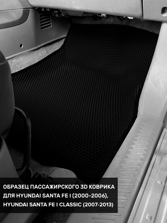 Автомобильные 3д коврики для Hyundai Santa Fe I Classic (2007-2013) в салон авто и багажник сделаны из инновационного полимерного материала EVA, изысканная структура в виде ячеек не дает воде, пыли и снегу разлетаться по салону машины и багажнику. 3д коврики зафиксированы на полу определенными клипсами, соответствующими Hyundai Santa Fe I Classic (2007-2013), и не двигаются в процессе езды.