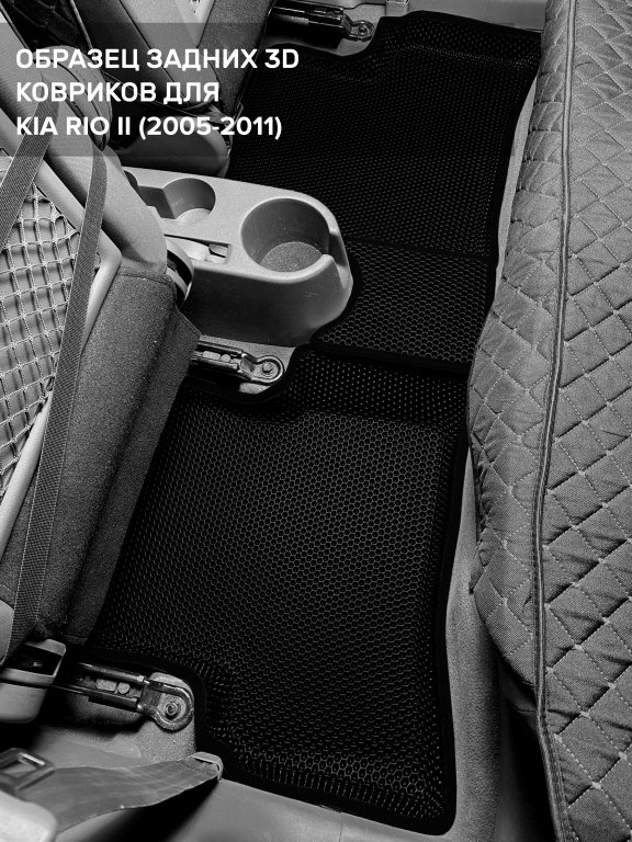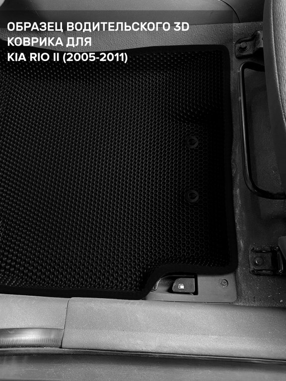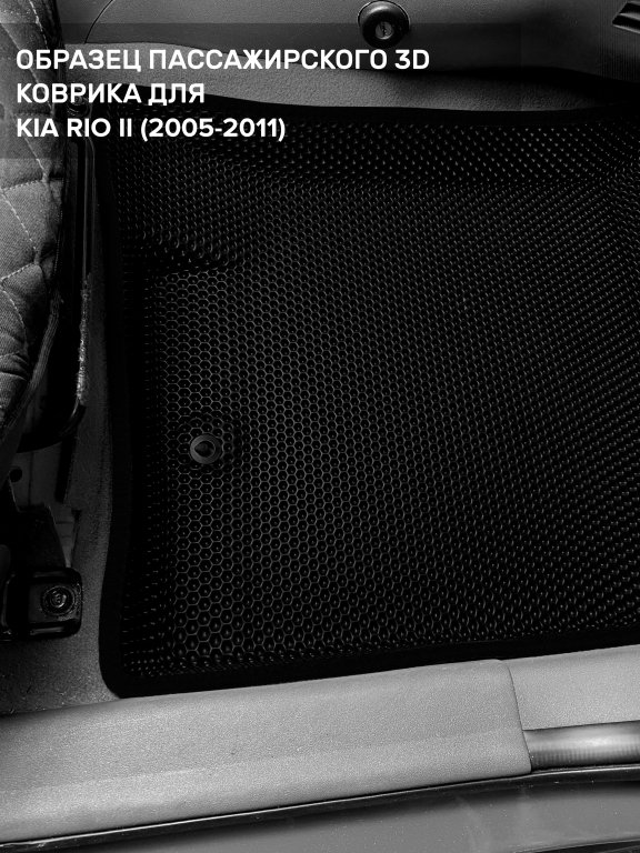 Автомобильные 3д коврики для Kia Rio II седан, хэтчбек (2005-2011) в салон авто и багажник сделаны из инновационного полимерного материала EVA, изысканная структура в виде ячеек не дает воде, пыли и снегу разлетаться по салону машины и багажнику. 3д коврики зафиксированы на полу определенными клипсами, соответствующими Kia Rio II седан, хэтчбек (2005-2011), и не двигаются в процессе езды.